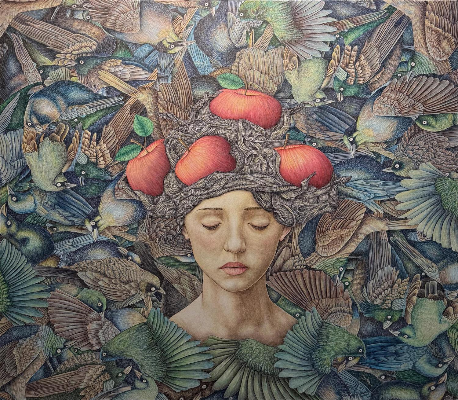 از سویی هنرمندی دیگر، ذهن و اسطوره را میکاود و در سکوت عیان از هر چهره، به خلق پروانهها، برگها و درختانی برآمده که از درون حامل نشانههای دگردیسی و مکاشفهاند.